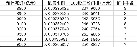 预期冻资9100亿,100正股对应门槛250万,200正股对应500万,300正股对于750万,400正股对应1000万。
