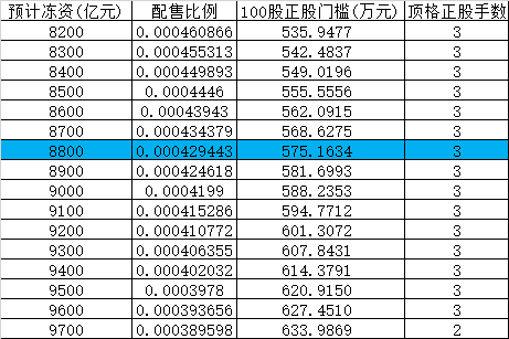 - 1+0份额(1手正股):8800亿冻资对应门槛约575万元,建议加安全垫至595万元起(获配概率≥93%),资金量小于560万元大概率陪跑,浪费利息。