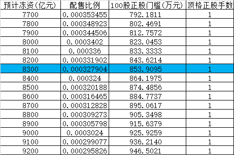 - 1+0份额(1手正股):8300亿冻资对应门槛约854万元,建议加安全垫至874万元起(获配概率≥93%),资金量小于830万元大概率陪跑,浪费利息。