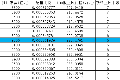 - 1+0份额(1手正股):9000亿冻资对应门槛约225万元,建议加安全垫至245万元起(获配概率≥93%),资金量小于220万元大概率陪跑,浪费利息。